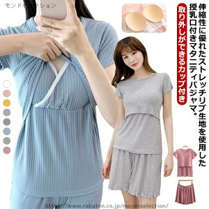 伸縮性に優れたストレッチリブ生地を使用した授乳口付きマタニティパジャマ。【取り外しができるカップ付き】ストレッチ素材で、産前から産後まで、長く着用いただけます。妊娠時はお腹にやさしくフィット、産後はすっきりと着用でき