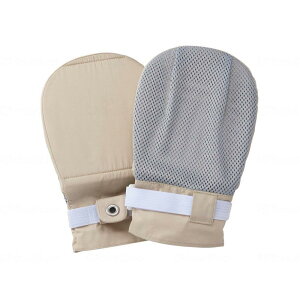 手首ベルトの上からアイデアホック付ストッパーをかぶせて留めるため、使用者本人にはミトンを外しにくい構造です。手の甲側にメッシュ素材を使用しているため蒸れにくく、またミトンをつけたままでも手の状態を確認することができます。...