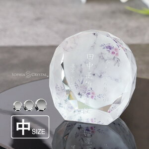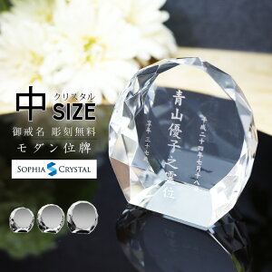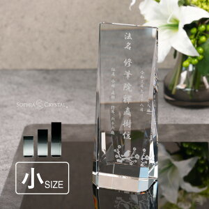 手作業で丁寧にカットし研磨されたクリスタルガラスに日本の職人が丁寧に心を込めて戒名を彫刻します。経年劣化が少なく家具調のお仏壇にも良く合い、心癒される美しいお位牌です。