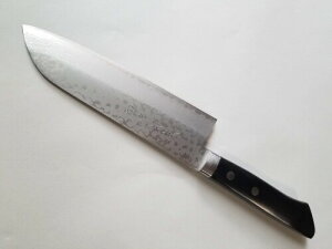 槌目ダマスカスにサビに強く切れ味の鋭いVG10を割り込んだ高級感のある剣型牛刀包丁です。サイズは190mm(実寸刃渡りは200mm)で、肉やキャベツのかたまりをザクザク切るにはちょうど良いサイズです。外国人のお客様からも大変人気の包丁