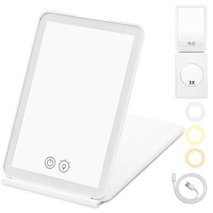 「1X倍3X倍の拡大鏡」片側が1倍で、もう一方が3倍です。1倍の側は日常の使用に最適です。拡大側は顔の細部に焦点を合わせ、完璧なメイクを実現するのに役立ちます。 「3色のライト調光可能」このライト付きミラーには...