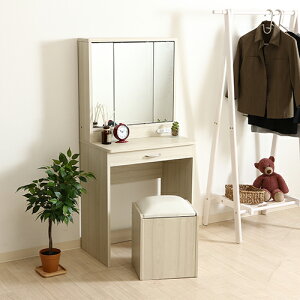 商品詳細 ■三面鏡のドレッサーです。 ■やわらかな印象を与えてくれる木目調デザインです。 ■鏡部分が扉になっており中は収納スペースになっています。 ■棚板は収納する物に合わせて高さを調節できる可動棚です。 ■引き出しもあり