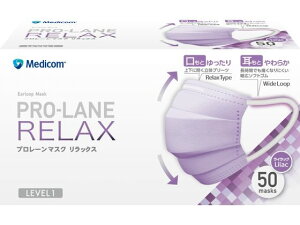 メディコム プロレーンマスク リラックス ライラック レギュラーサイズ 50枚入り。容量:1箱(50枚)。カラー:ライラック。サイズ:レギュラーサイズ(約89x178mm)。製造販売元:A.R.メディコム...