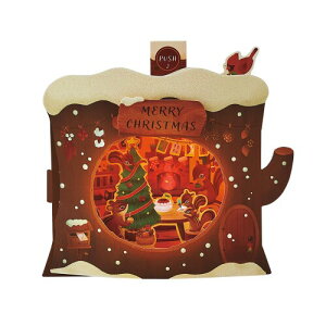 商品の特徴 絵本のような世界観がかわいい、切り株をくり抜いたリスのお家のカードです。 ボタンを押すたびに曲が変わり、お部屋の中と暖炉の火が、間接照明のように優しく光ります。 雪部分にラメ加工が施された、華やかな仕上がりで