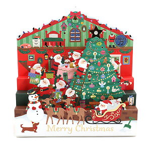 サンタクロースがクリスマスの準備中♪おうち型の可愛いオルゴールカード。 小さなサンタクロースたちが家の中でクリスマスを楽しむ様子を描いた、可愛らしいおうち型オルゴールカードです。 クリスマスの準備を楽しむサン
