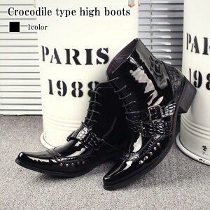 【商品名】クロコダイル型ハイブーツ【カラー】ブラック【サイズ】24 245 25 255 26 265 27【素材】PU【季節】春 夏 秋 冬【スタッフコメント】人気のクロコダイル柄を取り入れた、レザーショートブーツ。エナメル特有の艶...