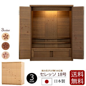 桜の花びらが舞う美しいお仏壇、セレッソ。安心の国産品。扉に桜の花びらが舞う、素材の天然木を生かしたシンプルでおしゃれなお仏壇です。15号、18号、20号の3サイズ。15号は内段が2段、18号と20号は3段仕様になっています...