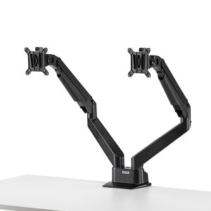 薄く、短いクランプで様々なデスクに設置できる!アームの左右回転角度を用途に合わせて変更。デュアルモニターでマルチタスクの効率を向上。目線の高さに合わせて、位置を変更できる。