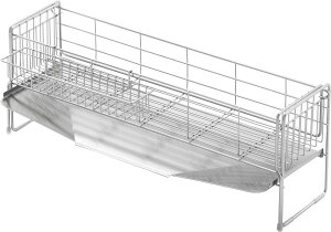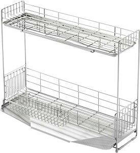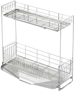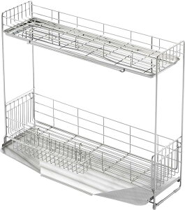 シンクサイドのわずかなスペースに設置できる2段水切り。下段は伸縮するので大容量。上段もトレー付きなので水が下に落ちず、下段は斜めトレーでシンクに直接流れていきます。便利な小物ポケット付き。