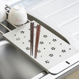 桜模様が可愛いキッチンアイテム。 シンクのサイズに合わせて伸縮できる水切り。 食器類の水切りはもちろん、まな板受けとしても使えるので、狭いシンクを有効活用できます。 ■伸縮トレイ 桜 素材:本体/18-0ステンレス、パイプ部/18-8ス