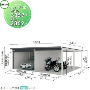 商 品 詳 細商品名ヨドガレージ ラヴィージュ3 標準高タイプ 一般型 VGC-3359+VKC-2859サイズ(mm)幅6153.5高さ2349奥行き5921 有効開口寸法:幅3080.5・2712高さ1892...