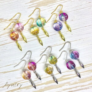 筋のような模様の入った可愛い色合いのビーズがチェーンの下で揺ら揺らと揺れるピアスです。まるで夏祭りで売っている飴玉かヨーヨーのようで、ボールビーズが涼やかで可愛らしいです。【素材】ビーズ 合金(金メ