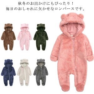 秋冬のお出かけにもぴったり!毎日のおしゃれに欠かせなロンパースです。ふわふわ軽く暖かい着心地!もこもこのボアで見た目にもあったかいです。フード部分にくま耳をあしらったキュートなデザインでベビーちゃんがカワイイクマさん