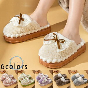 冬スリッパ レディース メンズ ルームシューズ 裏起毛 厚底 レース リボン付き スリッパ カップル ペア 秋冬 暖かい もこもこ 防寒対策 保温性 厚手 ペアルック ペアスリッパ シューズ おしゃれ...