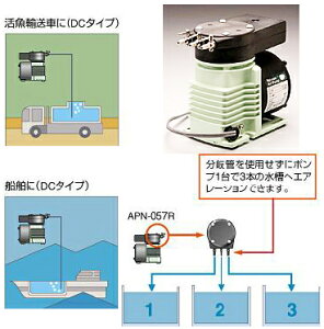 ダイヤフラム式エアポンプ バッテリー電源タイプ ・モーター直結のコンパクトなエアーポンプ ・1台で数本の水槽にエアレーション APN-057RーD1, D2 接続口径/5.3mm 最高風量/7L/min 最高風圧/0.04MPa 消費...