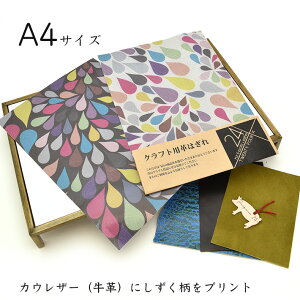 牛革にカラフルなしずく柄をプリント仕上げした革をA4サイズにカットしています。総柄プリントされています。使いやすいA4サイズですので、小物入れやパスケース、ブックカバーなど細々とした小物づくりに最適です。カラフルなしずく柄