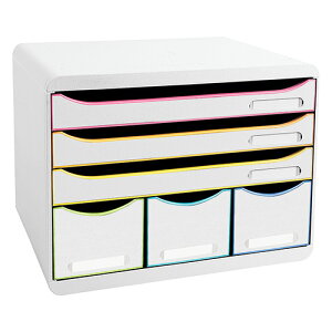 規格:A4判ヨコ型,3段+小物ポケット 外寸:幅355×奥270×高271mm 重量:2.9kg 引出内寸:上段=幅324×奥248×高31mm,小物ポケット=幅92×奥248×高77mm 材質:PS(静電防止)