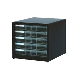 A4フラットファイルが収まります。本体色はブラックで引出し色は透明の鍵なしタイプです。本体はポリプロピレン(PP)、引き出しはスチロール樹脂(PS)製です。間口は278mm、奥行は350mm、高さは258mmです。引出しはA4浅型5個...