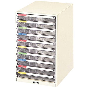 ●仕様:浅10段x1・B4タテ型。●材質:本体/スチール、引出し/透明スチロール樹脂。●浅引出し内寸:W259xD382xH37mm。●等分布耐荷重:B4浅/約1.5kg、B4深/約2.5kg。●本体...