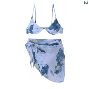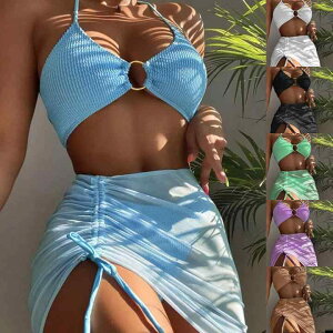 きれいなシルエットを演出するレディース水着3点セット盛れる×谷間がきれいに見えます。デザイン性×体型カバーどちらも叶えるお洒落なビキニ。胸下のクロスがお洒落。パレオ付き、気になるおしりや太ももを可愛くカバー...