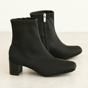 撥水 ストレッチショートブーツ ◇ 今っぽくハンサムに決まるスクエアトゥ。 美脚魅せを叶える5.5cmチャンキーヒールは、太めの形状で安定感も抜群。 ダイバースーツをイメージした滑らかなストレッチ素材 ゆったり履けるのに足にフ