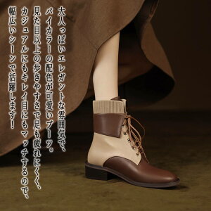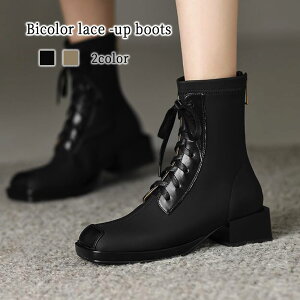 【商品名】バイカラーレースアップブーツ【カラー】ブラック ベージュ【サイズ】225 23 235 24 245 25【素材】PU【季節】春 夏 秋 冬【スタッフコメント】配色カラーが目を引くショートブーツ。低めのヒールで歩きやすく、足...
