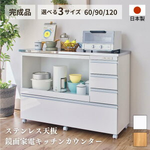 ・ストッパー付キャスターで女性でも簡単に移動できます。お掃除のときやテーブル横に持ってきてワゴンとして使うのも便利です。・引き出しは上段以外スライドレール付きで簡単に引き出せる・カウンターの前面を鏡面仕上げを施し、清