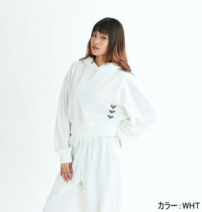 ショート丈のフードプルオーバートップス。ワイドシルエットで、裾と袖口をリブで仕上げました。軽めの裏毛を使用しているので、乾きやすいのが特徴です。左裾には刺繍のROXYハートを縦に3つ並べてアクセントをプラス。フード口のロゴ