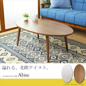 おしゃれでかわいいオーバルデザインの木製リビングテーブル、アビレ。★ 天板に木目の美しい天然木突板を使用し、北欧テイスト溢れる雰囲気。★ 幅90cmのコンパクトなデザインは狭いお部屋にもぴったりです。★ 高さを抑え