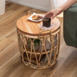 ラタン、ラッカー塗装■生産国インドネシア■特徴●取り外し可能な天板が付いた、収納ができるラウンドテーブル●取り外し可能な天板天板は取り外す事が出来るので、収納バス