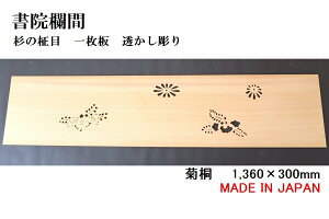約1,360mmx300mmx7mm 材質・樹種 板:杉の柾目 無垢 国産杉の柾目を使用しますが、天然木・一枚板のため、写真の商品とは木目・色合い等が異なります。 彫刻 透かし彫り/菊桐 作者銘 無し(追加可)...