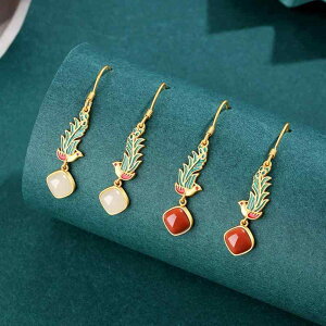 ・カテゴリ: イヤリング・対象: レディース・スタイル: 中国風、文芸レトロ・素材: 925銀・形状: 水滴型・デザイン要素: 龍鳳紋飾、民族/国風・色展開: 金色孔雀南紅瑪瑙、金色孔雀和田玉