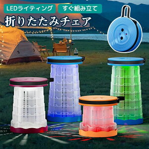 白いLEDライト付き!おしゃれ感のある折りたたみチェア。伸縮式で高さ調整可能、底部が滑り止めになっているので、すべったところに置いても滑りません。行列時に少しづつ進む時もサッと座って立って移動できる高い座面、スパッと出し