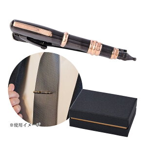 洗練されたデザインと機能性を兼ね備えたアクセサリーです。高級感溢れる光沢のあるメタル仕上げと、独特の万年筆の形状が特徴で、ビジネスシーンにおいても個性を際立たせます。シンプルながらも目を引くデザイ