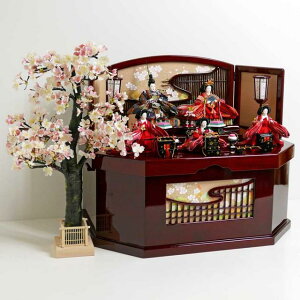 商品説明※お人形の手持ちの道具、頭飾りは付属します。サイズ(cm) 間口105×奥行100×高さ105。仕様 三段飾り 五人飾り お道具:三方、菱台(菱餅)、高坏(たかつき)、お駕籠(おかご)、重箱、御所車、桜橘。