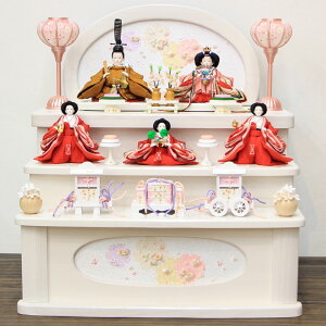 ひとつひとつ丁寧に作られており、高級感を演出します。コンパクトな間口で三段飾りをお楽しみいただけるのも、木目込み人形ならではの魅力です。他とは違うお雛様をお探しのお客様にもおすすめの一品となっております。 サイズ:間口45×奥行33×...