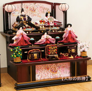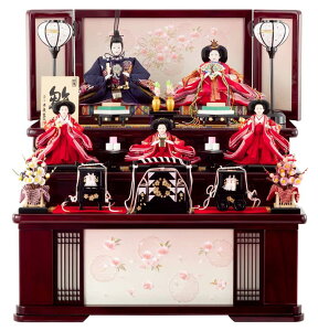 頭飾りは付属します サイズ(cm) 間口63×奥行44×高さ43.5 仕様 ケース飾り 五人飾り 三段飾り 三人官女 お道具:お駕籠(おかご)、御所車、桜橘 送料 送料無料 ただし、北海道、沖縄