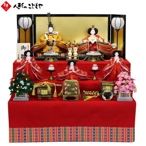 [サイズ(cm)] 間口80×奥行70×高さ72 [仕様] 三段飾り 五人飾り 江戸ひな飾り 優雅雛 衣裳着人形 毛氈 お道具:油灯、三方、菱台(菱餅)...