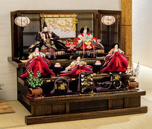 桜の花を描いた気品あふれる金箔屏風は、深みのある色合いで仕立てた飾り台によく映え、おめでたい雰囲気を引き立てています。通常の三段飾りとは異なり、五人囃子の下にもスペースがありますので、高級感あふれる溜塗りのお道具を飾ることが出来ます...