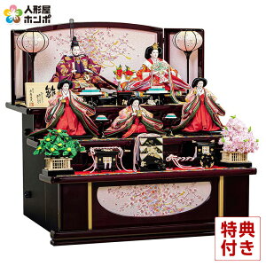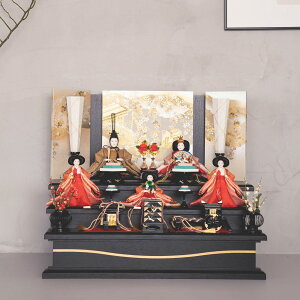 華やかな三人官女を合わせました。お道具も細部までこだわって製作され、見応え十分な仕上がりとなっております。飾り映え抜群の三段飾りは引き出し式のたっぷり収納となっており、オフシーズンには中にお人形やお道具がしまえる優れものです...