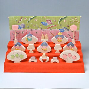 円を中心から放射状に分割してできる扇形が、人形や調度の基本形になっています。 一段目は親王、姫、ぼんぼりに三方徳利、二段目は三人官女、高杯、三段目には桜、橘、膳を配しました。 本体は24ミリ厚のメープル材を使用しました。白