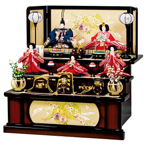 “雪輪にさくら柄”の刺繍がほどこされた屏風に、花梨色の塗り飾り台が、気品ある雰囲気をかもし出す三段飾りです。 三段飾りでは珍しい収納タイプで、引き出し式になってますので、飾るのも片付けるのも簡単で、お人形...