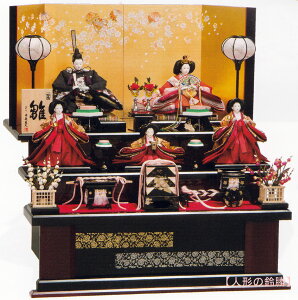 ※お人形の手持ちの道具、頭飾りは付属します サイズ(cm) 間口80×奥行85×高さ90 仕様 五人飾り 三段飾り お道具:三方、菱台(菱餅)、高坏(たかつき)、お駕籠(おかご)、重箱、御所車、紅白梅 送料 送料無料...