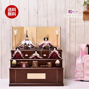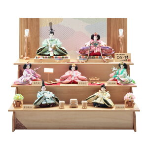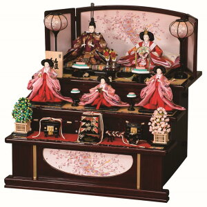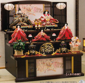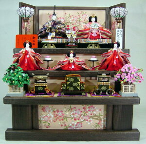 ット、お被布、彫刻木札、オルゴールをお付けします。 家具調で仕上げた、間口80cmの綺麗な三段飾りが誕生しました。金糸を多く使用した帯地金襴、唐織錦更紗大華紋を着せ付けた親王揃えや、朱色を基調に...