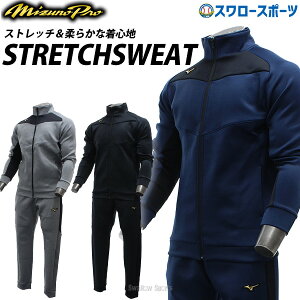 ストレッチと柔らかな着心地が特徴のストレッチスウェットフーディ・ストレッチスウェットパンツのセットアップ。◇ミズノプロ・脇ポケット付き・ウエストスピンドル仕様・ダイナミックPLUS・ダイナモーション