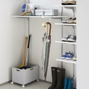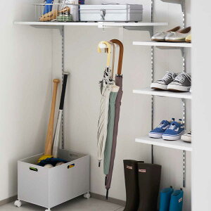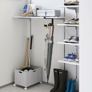 商品説明長傘をシューズクロークや下駄箱に収納して玄関をスッキリ。ハンギングタイプの傘立てです。棚板に挟み込んで調節ネジで締めるだけの簡単設置。折り畳み傘やリュックなどの収納にもおすすめです。レインコートの一時掛けとし