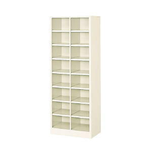 外寸:W1000×D330×H1590(mm) ボックス内寸:W220×D315×H480(mm) 材質:スチール、紛体塗装 質量:36.5kg カラー:ホワイトグレー 段:中棚付き4列