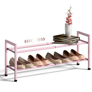 省スペース 靴 収納 下駄箱 段ボールストッカー 玄関 廊下 鉄パイプ45cmから83cm伸縮 組み立て式(2段・ピンク) 【シューズ収納ラック】この2段階調整可能なシューズラックは、幅45〜83cmに調整でき