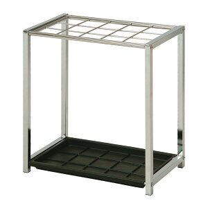 シンプルな金属製の傘立て。傘を15本立てることができます。サイズ:W480×D293×H512mm、1マス:80×85mm。重量:3kg。材質:本体:鋼(クロム)、トレー:ポリプロピレン。形態:お客様組立品。