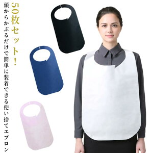 使い捨ての不織布エプロン50枚セットです。頭から被るだけ!装着5秒。おしゃれで快適な白と黒などの不織布エプロン。焼き肉、ハンバーグ屋さん、介護など、服汚れ防止のため、ご利用ください。また、病院、介護施設でのお食事などの介